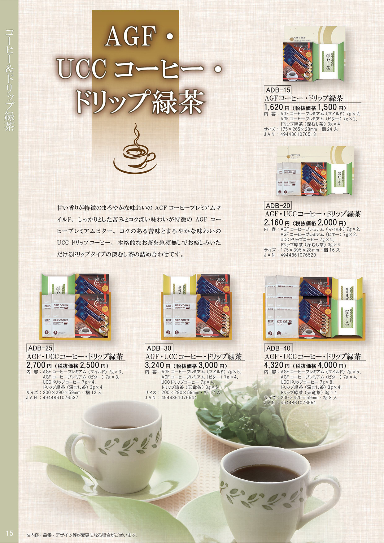 味わい深いAGFコーヒミックスやUCCドリップコーヒーとドリップタイプに仕上げた天竜茶や深むし茶を詰め合わせました。本格的なお茶をお楽しみ頂けます。