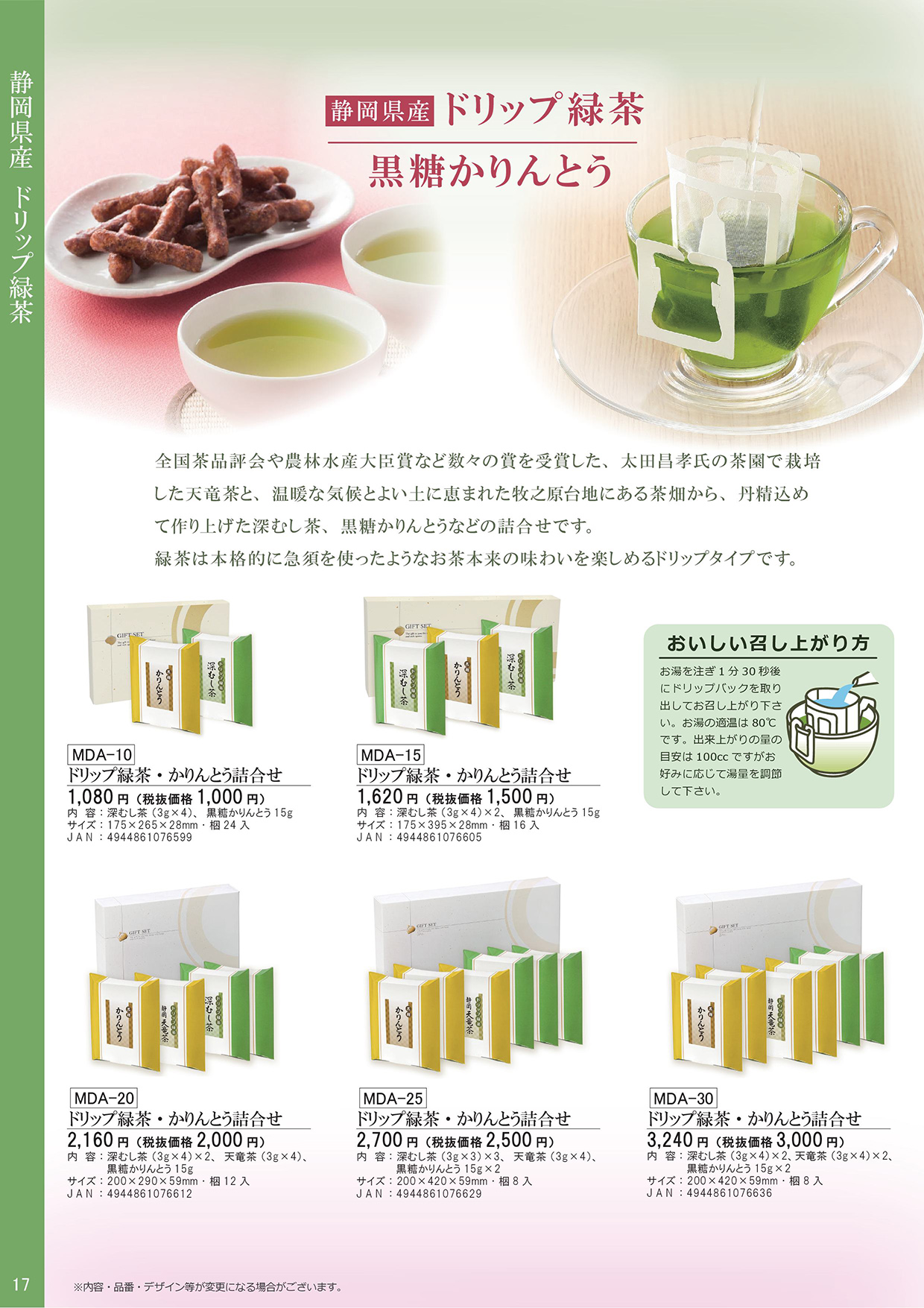 数々の賞を受賞した太田昌孝氏の茶園で栽培した天竜茶と丹精こめた深むし茶を使用したドリップは、お茶本来の味わいを楽しめます。2種のお茶とかりんとうの詰合せ。