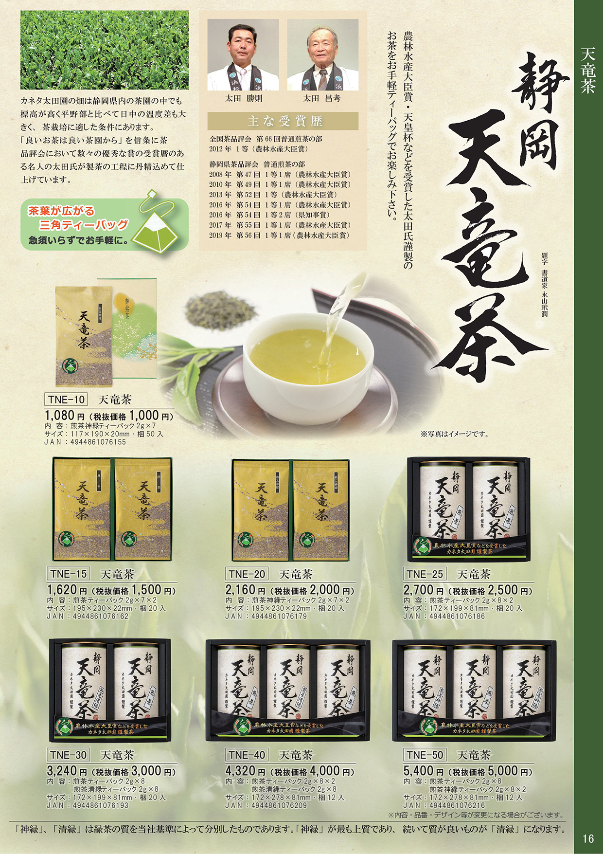 数々の賞を受賞した太田昌孝氏の茶園で栽培した天竜茶と丹精こめた深むし茶を抹茶入煎茶やコーヒーと詰合せました。